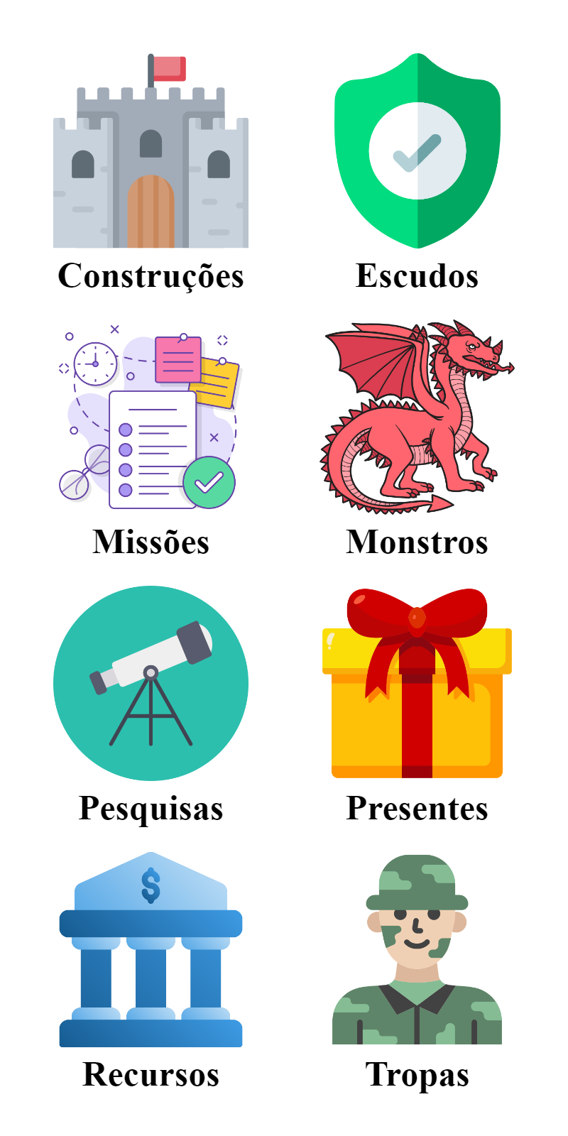 Envia Recursos, Abriga tropas, Envia Ajuda, Caça, Usa aceleradores, faz trocas com navio, treina e evolui familiares, treina tropas, entra em ninhos, evolui heróis, completa estágios dos heróis, faz coliseu, investe no tesouro, faz missões do festival das guildas, etc.
